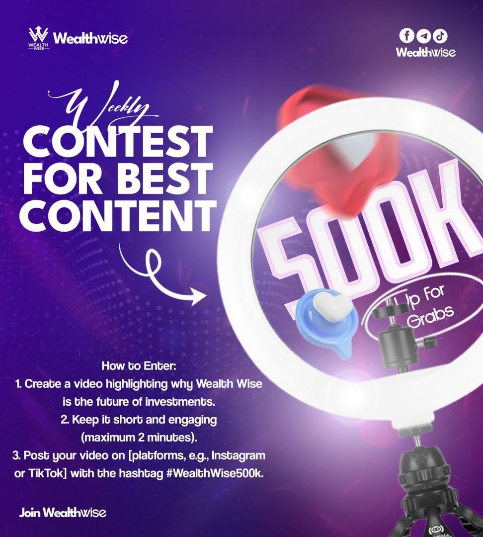 Exciting Opportunity with WealthWise!\r\n\r\nHow to Participate:\r\n\r\n1. Register with WealthWise.\r\n2. Create a video sharing your positive experience or thoughts about WealthWise.\r\n3. Post the video on TikTok and tag @wealthwise507 (official handle).\r\n4. Use the hashtag #wealthwise507.\r\n\r\nWeekly Giveaway:\r\n\r\n- WealthWise will review and select the top 10 videos each week.\r\n- 10 lucky winners will share a total of ₦500,000 (₦50,000 each).\r\n\r\nWinner Selection:\r\n\r\n- Winners will be contacted via TikTok direct message for account details.\r\n\r\nRepeated Opportunity:\r\n\r\nThis giveaway will run weekly, offering new chances to win!\r\n\r\nGet creative, share your story, and win big with WealthWise