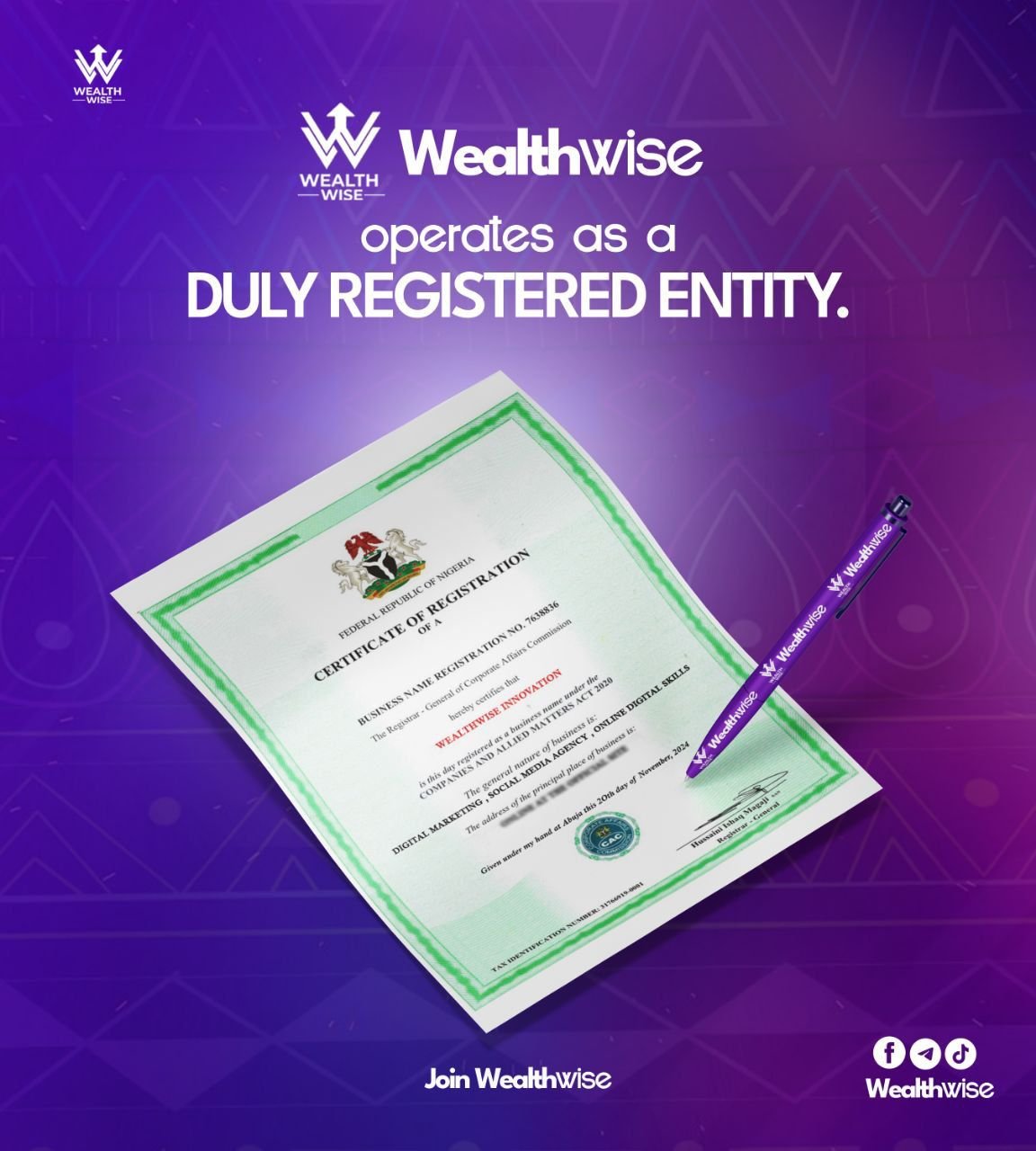 We Are Legally Registered & Trusted by Thousands\r\nProudly Registered with the Corporate Affairs Commission of Nigeria.\r\n\r\nAt Wealth Wise, transparency and legitimacy are at the heart of everything we do. We are officially registered with the Corporate Affairs Commission (CAC) of Nigeria under the registration number RC-7638836.\r\n\r\nThis registration affirms our commitment to operating within legal frameworks, building trust with our investors, and ensuring compliance with Nigeriaβs corporate governance standards. Whether you\'re investing in forex, crypto, agriculture, or digital solutions β you can rest assured that you\'re partnering with a fully recognized and accountable company.