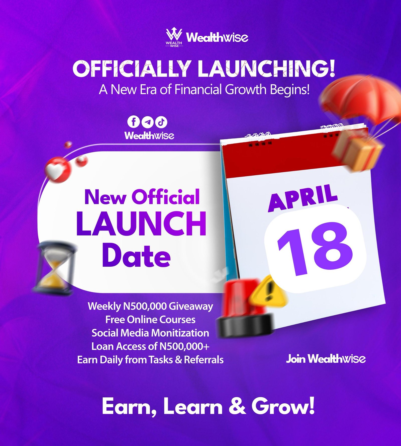 ANNOUNCEMENT... \r\nExciting News, Get ready to transform your financial future! WealthWise launches on April 18th at 9 AM UTC (10 AM WAT). Our innovative platform is designed to empower you to take control, build wealth, and achieve your dreams. We believe ]everyone deserves financial freedom. Our platform offers cutting-edge tools, expert insights, and personalized guidance to help you make informed decisions and reach your financial goals. Join our community and start your journey to financial freedom. Whether you\\\'re looking to invest, save, or build wealth, WealthWise is here to support you every step of the way. Mark your calendars for April 18th and get ready to: Grow your wealth Access valuable resources Achieve your financial dreams Stay tuned for updates on our launch. We can\'t wait to welcome you to the WealthWise community! #WealthWise #FinancialFreedom